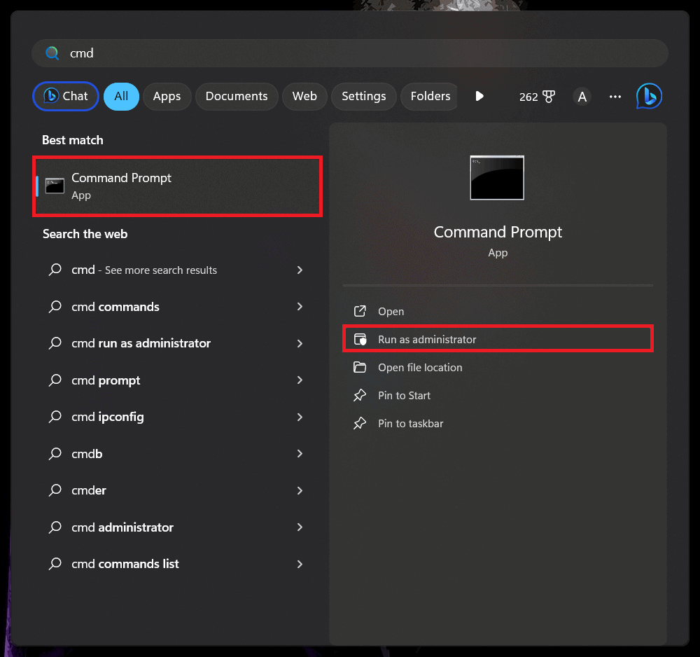 - Type Command Prompt , select it from the results, and then click on Run as Administrator .