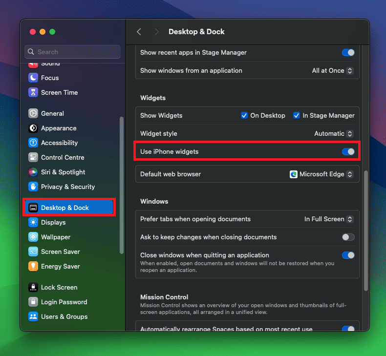 - Click on the Desktop & Dock on the left pane, and then enable Use iPhone Widgets .